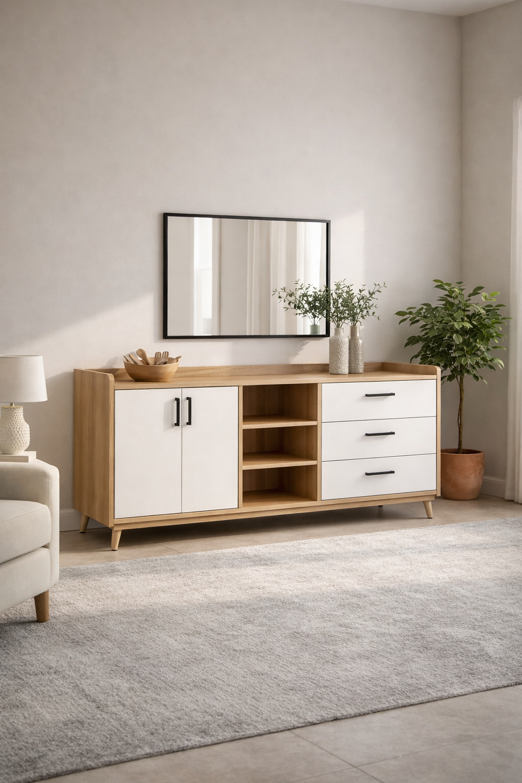 Sideboard mit Schubladen und Türen zur Aufbewahrung von Haushaltsgegenständen. Geeignet für Wohn- oder Essbereich und unterstützt eine strukturierte Organisation im Alltag.