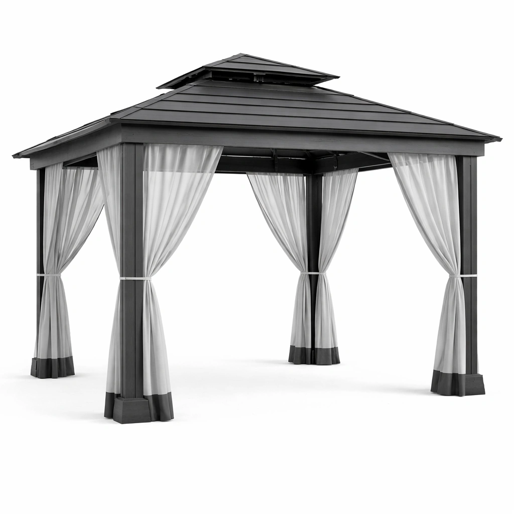 Materialien: Aluminiumrahmen, Dach aus 180g/m² Polyester, Vorhänge aus 160g/m² Polyester